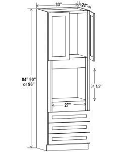 Shaker Gray - Oven Pantry - 30"W X 96"H X 24"D - Opening 24"W X 24-3/8"H. Two Door, One Large Open Shelf, Three Bottom Drawers. Note: Drawers May Be Removed To Accommodate Double Ovens.